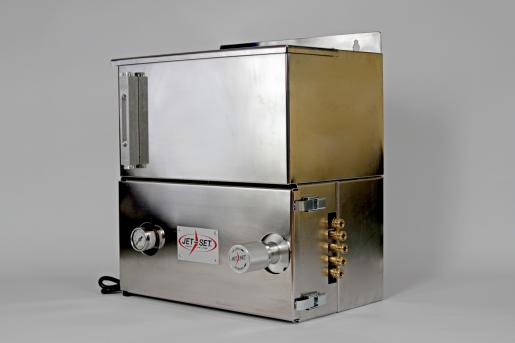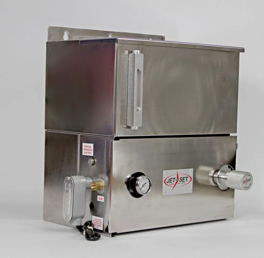 The MOD-1E JET-SET spray system comes standard with our 5 Gallon stainless steel tank with sight gauge, reusable filter, and air regulator. This industrial MOD-1E LUBRICATION SYSTEM includes one JET-SET 9100 stainless steel piston pump (0-5cc per stroke) with 5 outlets for spray nozzles. The 9100 pump is engaged using the electric solenoid to receive external signals for system activation. The MOD-1E comes standard 110v unless specified.